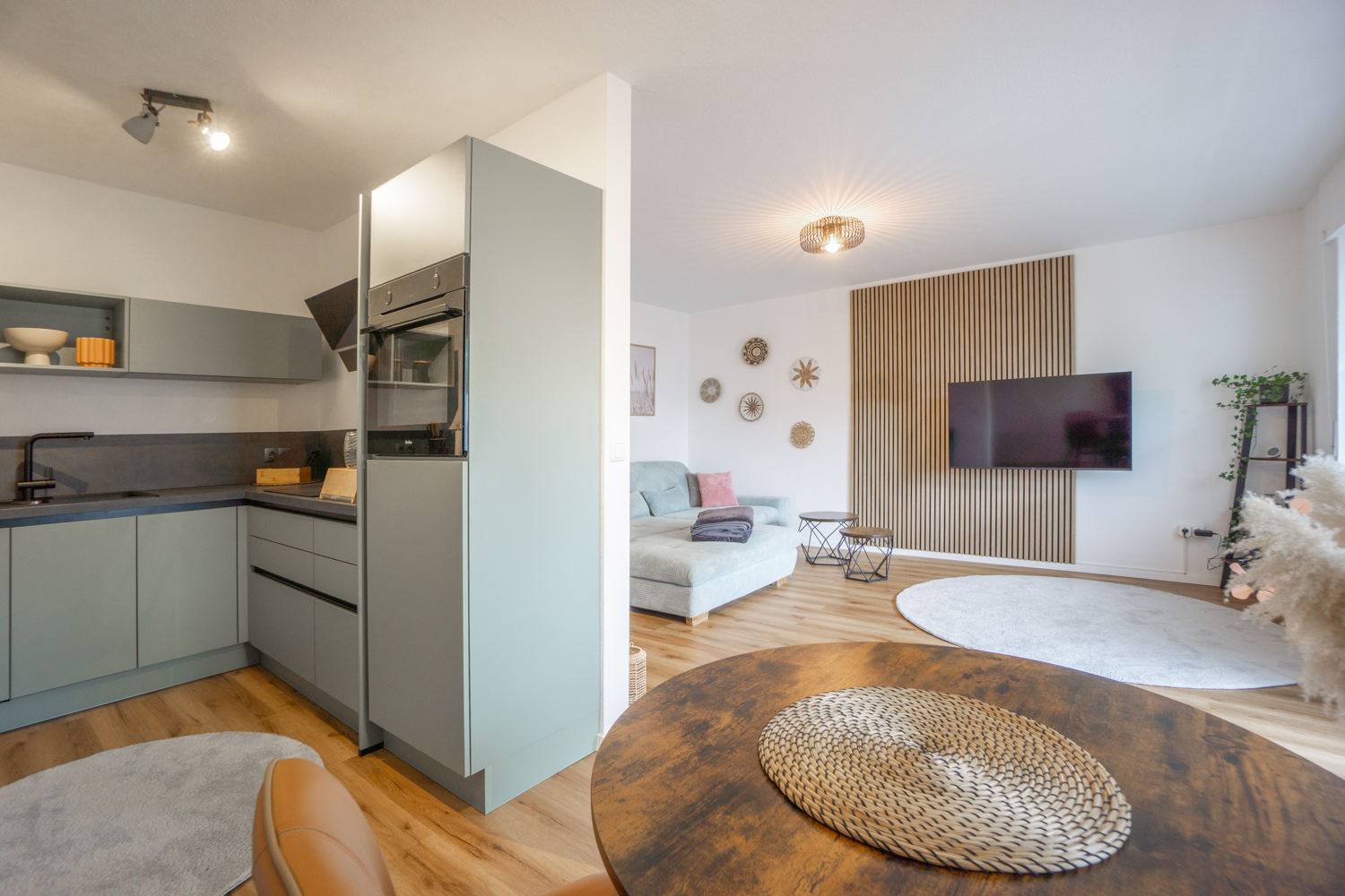 Der Wohnbereich besticht durch seine Helligkeit und die großzügige Fensterfront, die den Raum mit natürlichem Licht durchflutet. Neben einer gemütlichen Sitzecke lässt sich hier vor der teiloffenen Küche ein separater Essplatz einrichten, wodurch ideale Voraussetzungen für gesellige Abende geschaffen werden.
