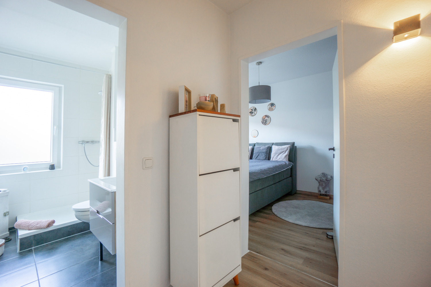 Über den Flur gelangt man in das gemütliche Schlafzimmer.