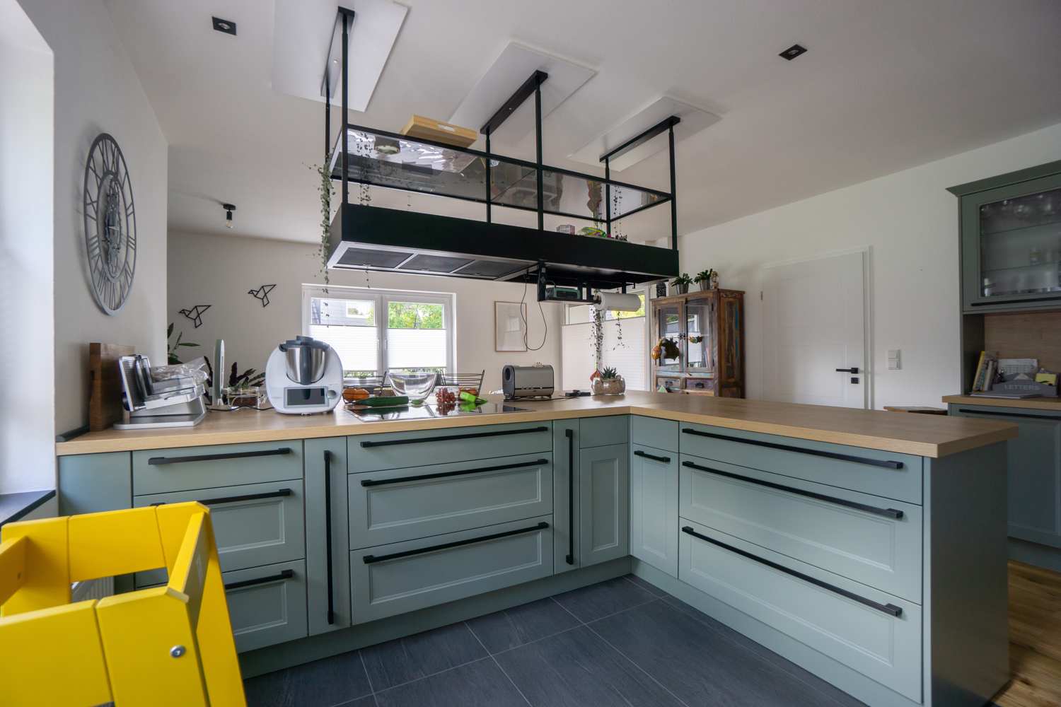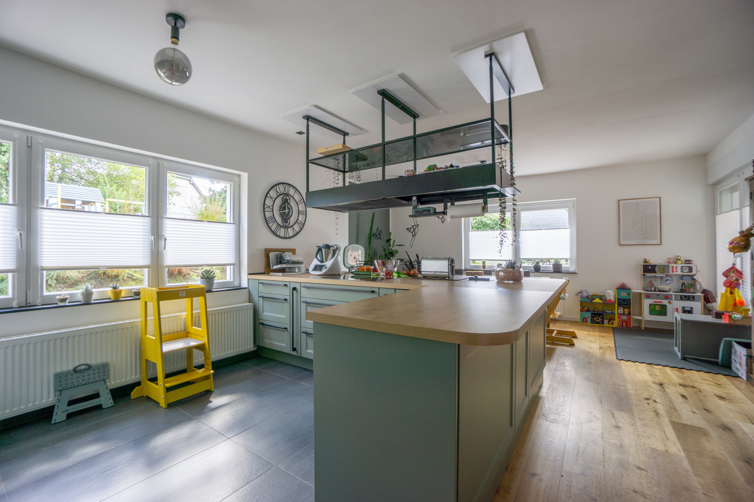 Vom Ursprungsbau aus gelangen Sie über einen Windfang in ein Zimmer, das zuletzt als Büro und Hauswirtschaftsraum genutzt wurde. Weiter geht es in das Wohnzimmer, welches als Durchgangszimmer angelegt ist und über einen kleinen Flur in die einladende Wohnküche führt.