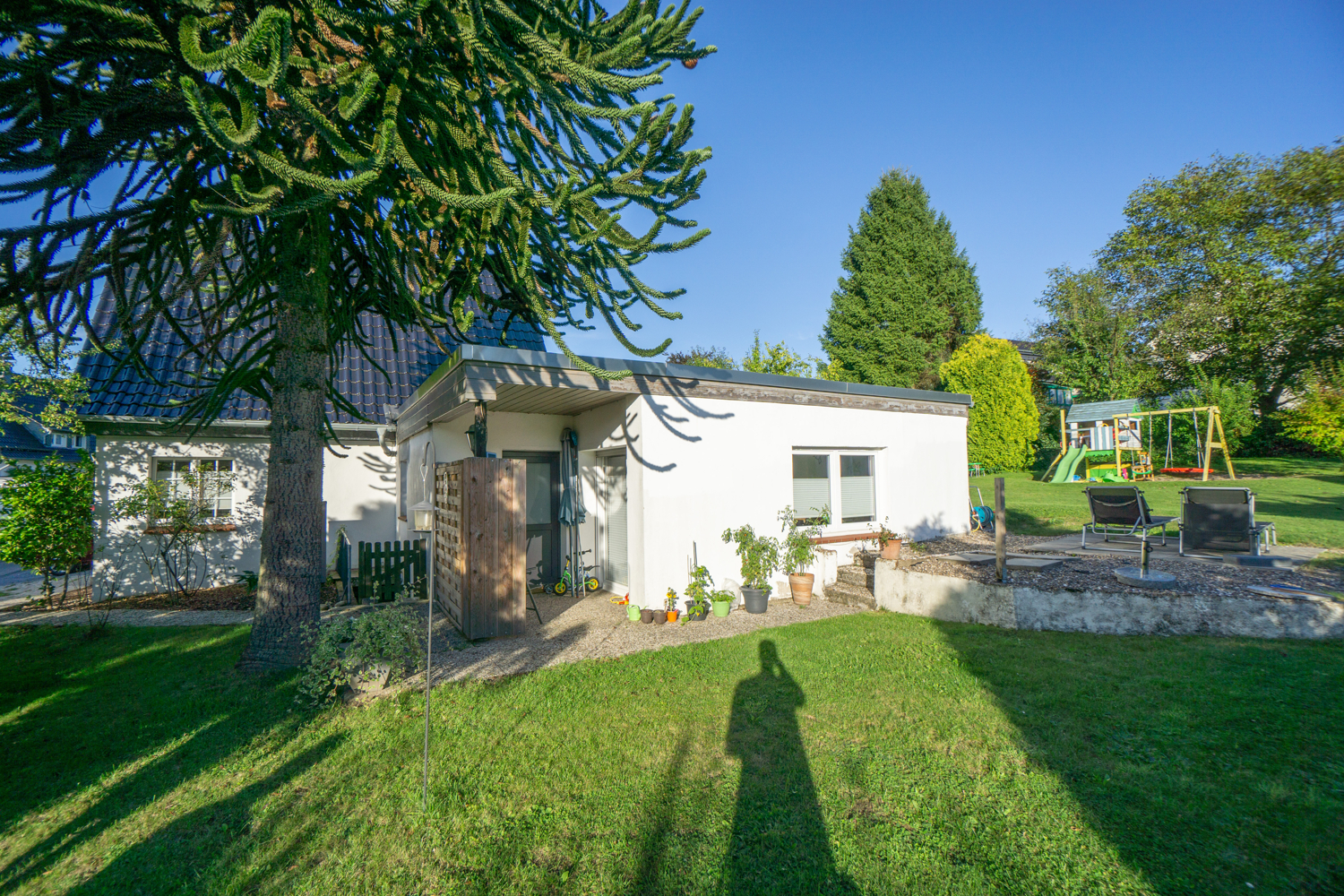 Auf dem großzügigen Grundstück befinden sich 2 Terrassenbereiche. Auf der neueren Terrassenanlage dient außerdem ein Gartenhaus als zusätzlicher Blickfang.