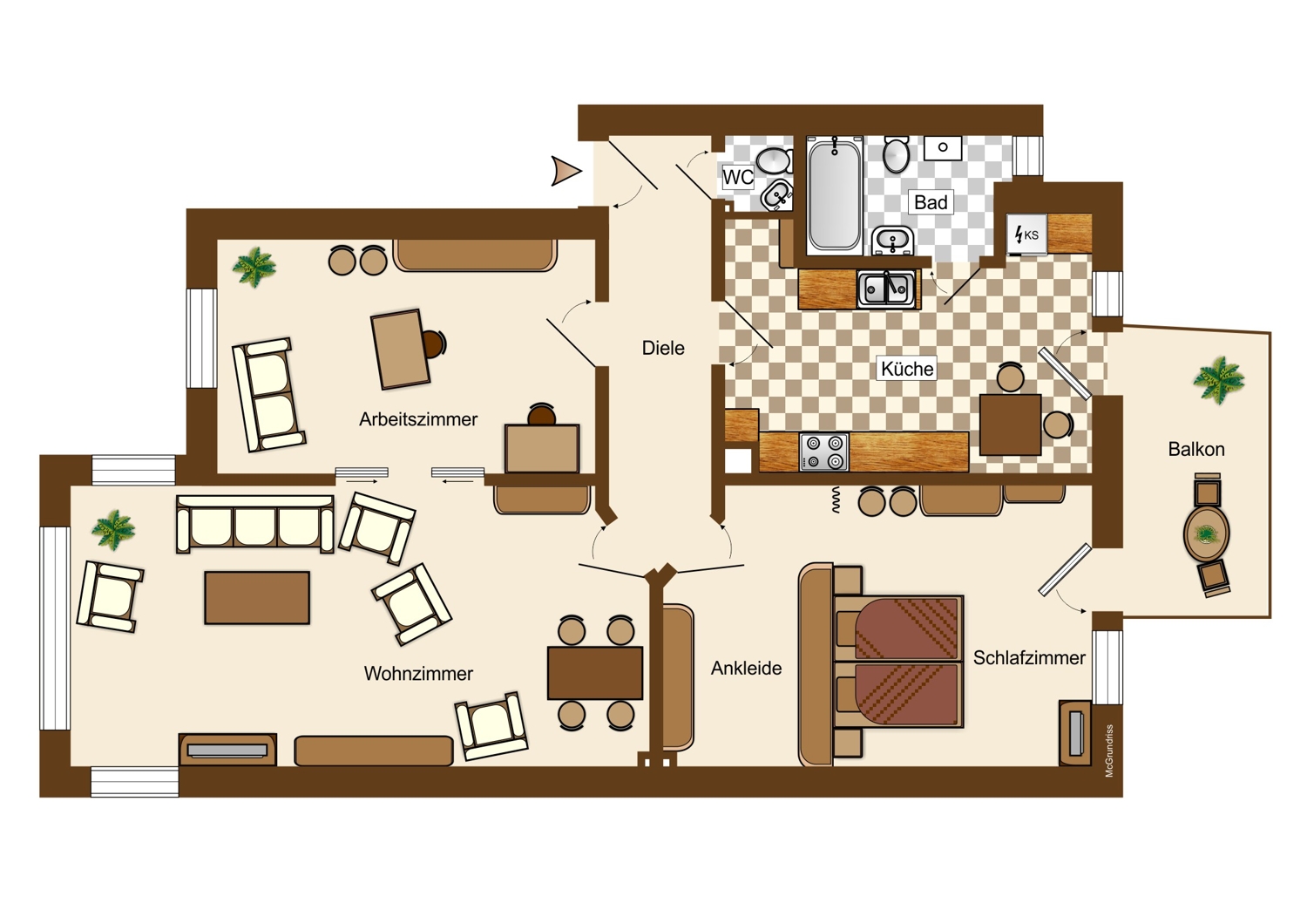 Rund 96qm verteilen sich gut geschnitten auf ein großes Wohnzimmer, ein Schlafzimmer, eine Küche, ein Badezimmer, ein WC, einen Balkon, die Diele und einen weiteren (zum Wohnzimmer hin offenen) Raum, den man problemlos auch als Arbeitszimmer oder weiteren Schlafraum umfunktionieren kann.