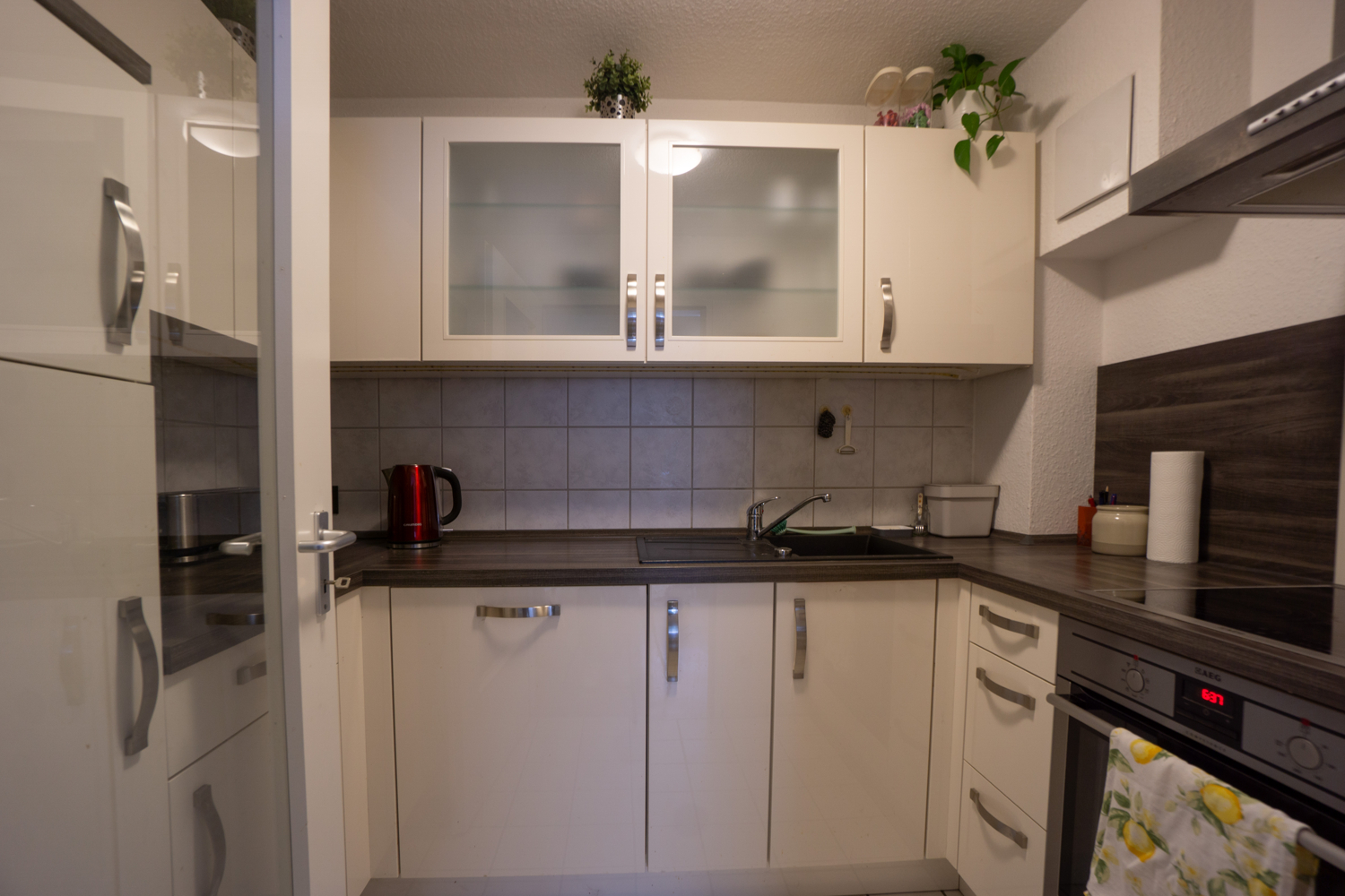 Die Küche ist in einer Nische untergebracht und vom Wohnbereich mit einer Glastür getrennt. Sie ist funktional und modern ausgestattet, perfekt für kulinarische Abenteuer. Die Küche ist im Kaufpreis enthalten.