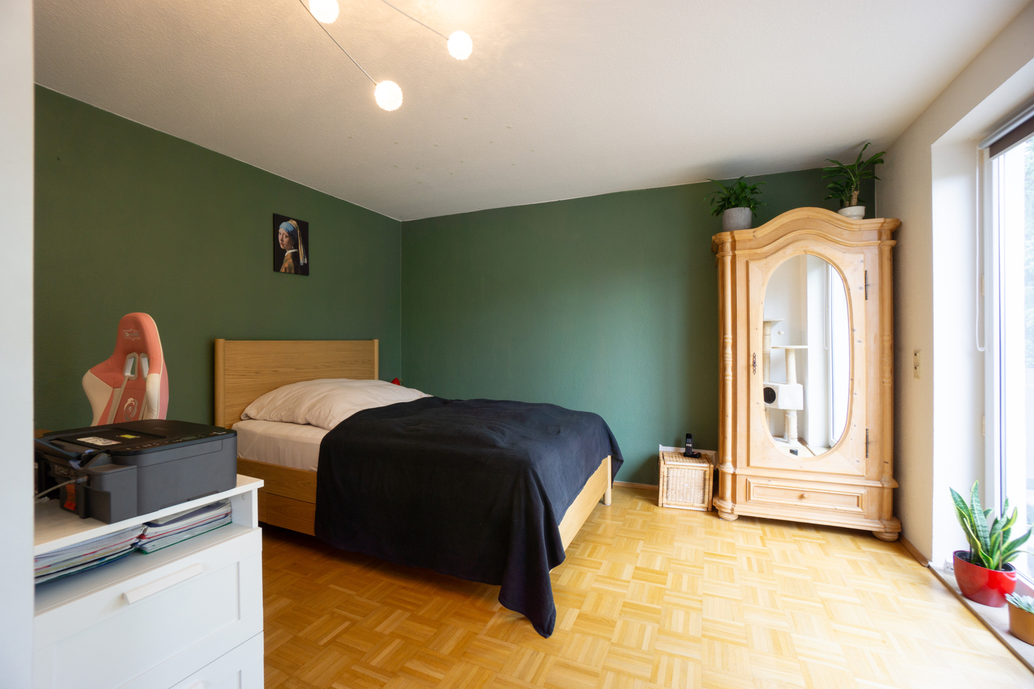 Der Wohn- und Schlafbereich ist großzügig gestaltet und optisch nur durch einen Schrank getrennt. Er bietet ausreichend Platz für eine gemütliche Einrichtung, zu der das Echtholzparkett beiträgt. Wohlige Wärme kommt über die installierte Fußbodenheizung.