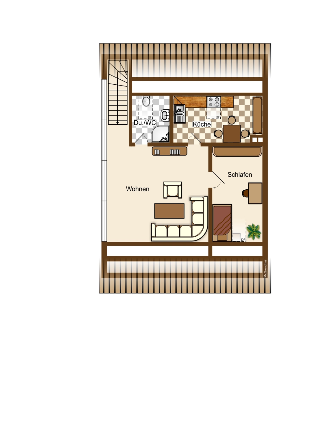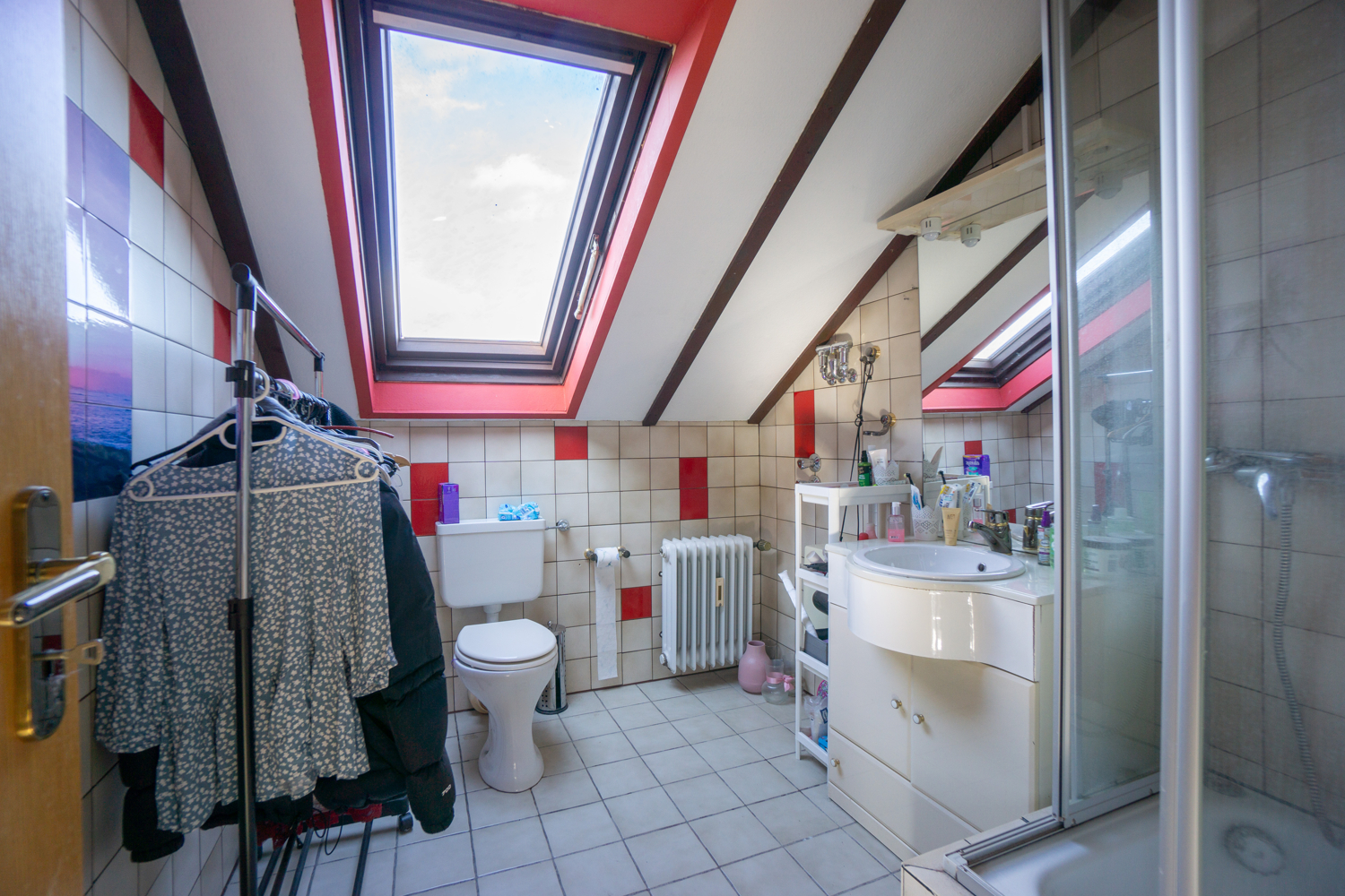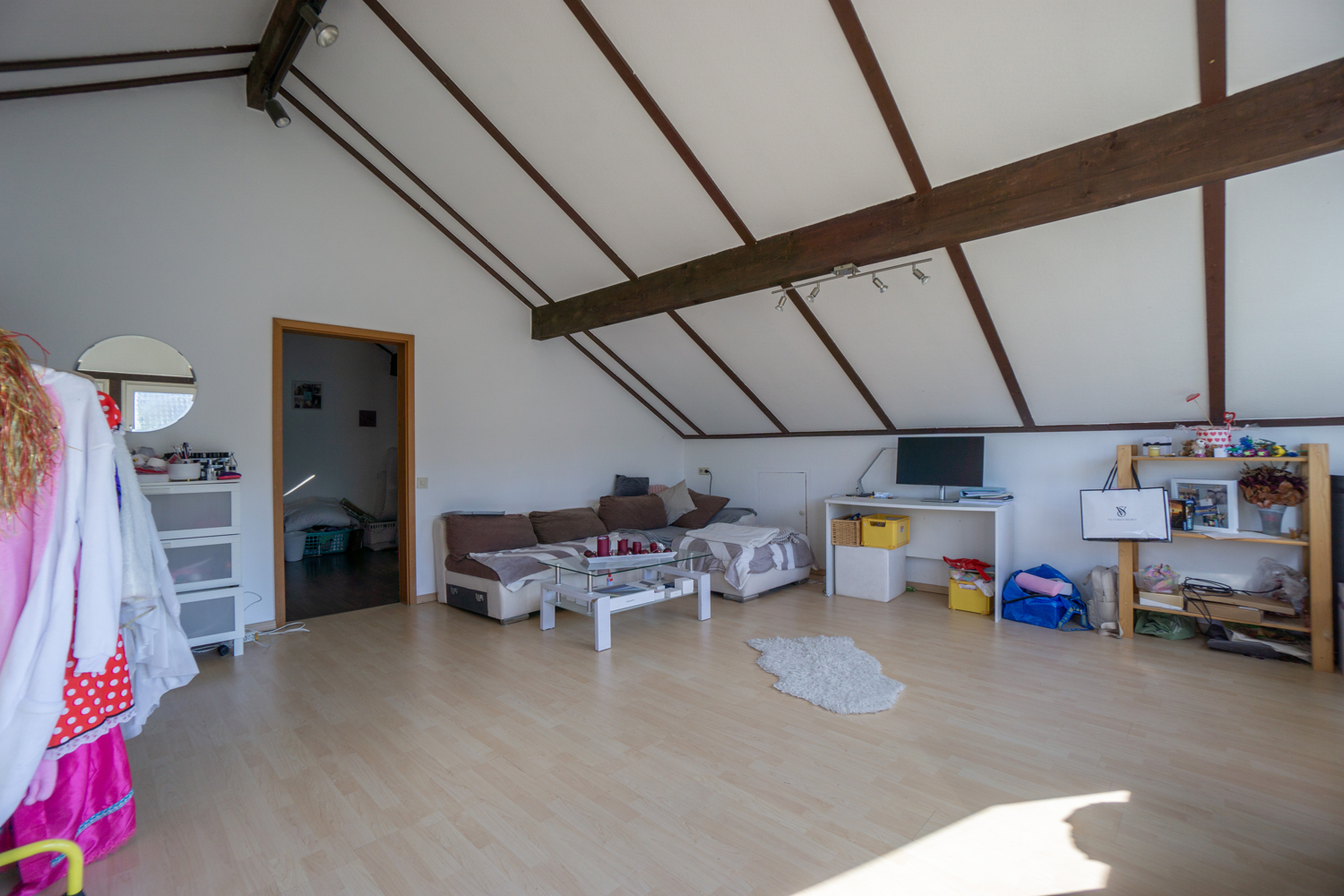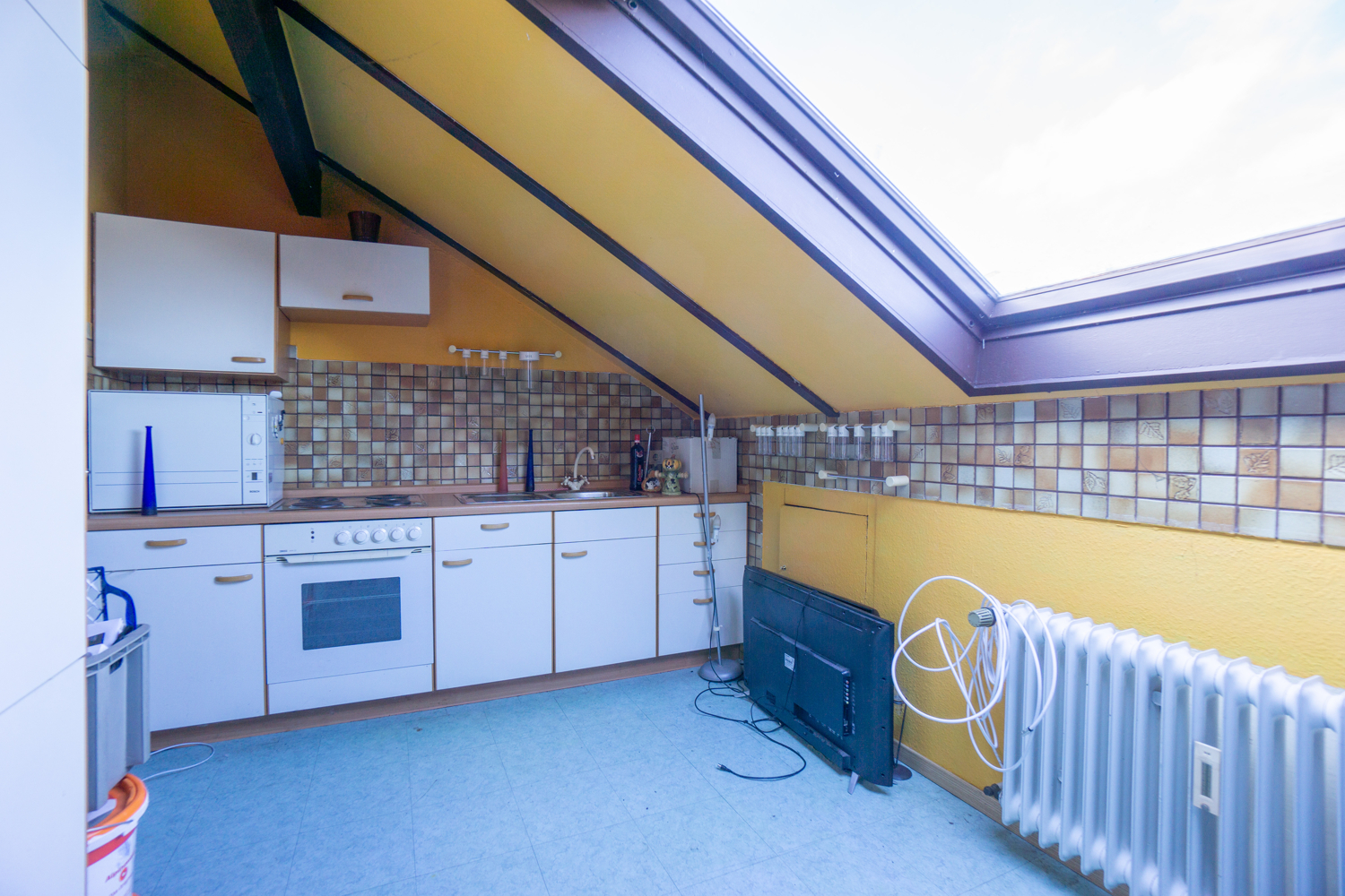 Über das Treppenhaus erreicht man das Dachgeschoss des Hauses in dem bisher die Tochter der Eigentümer gewohnt hat. Auf rd. 55m² hatte sie hier ihr eigenes Reich zu dem ein großes Wohnzimmer mit riesiger Fensterfront im Giebel, Schlafzimmer, Duschbad und Küche zählt.