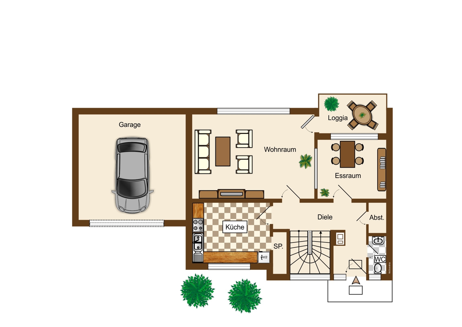 - Zimmer: insgesamt 3 (flexibel nutzbar als Wohn-, Schlaf-, Kinderzimmer oder Büro), Küche, Diele, Bad, WC, Abstellraum