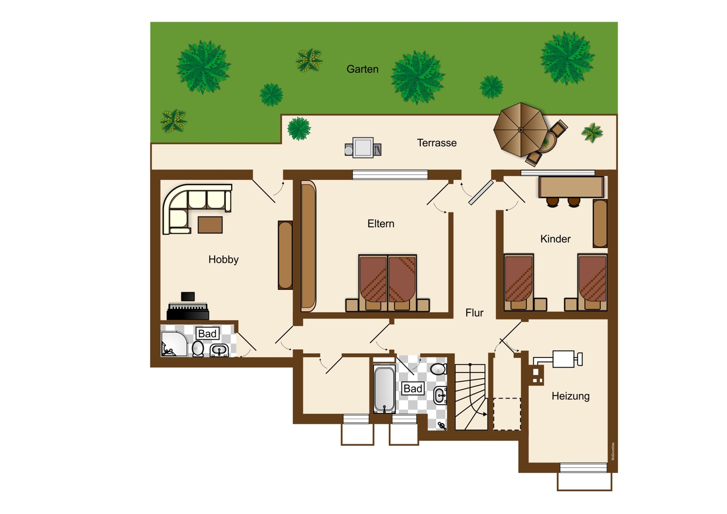 Im Untergeschoss stehen Ihnen neben zwei Schlafräumen zwei Badezimmer, ein Heizungsraum, sowie eine Abstellkammer zur Verfügung. Durch die nachträglich angebaute Doppelgarage hat das Untergeschoss ein zusätzliches Bad und einen wohnlich ausgebauten Raum erhalten, die die wohnlich ausgebaute Gesamtfläche auf rund 120qm erhöht. Auch die Terrasse mit rd. 15qm ist noch nicht in der Wohnfläche enthalten.