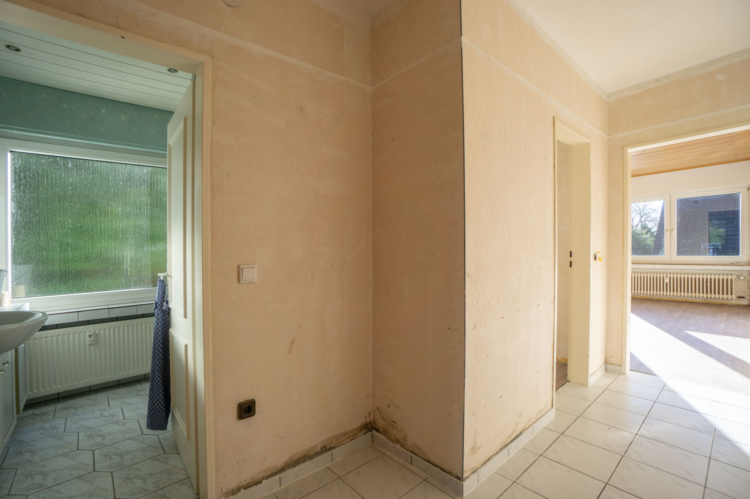 So wurden in Schlaf- und Wohnzimmer sowie der Diele bereits die Tapeten entfernt.